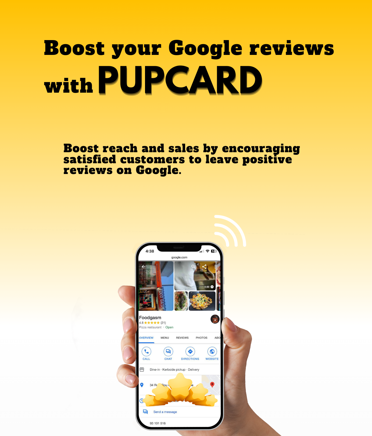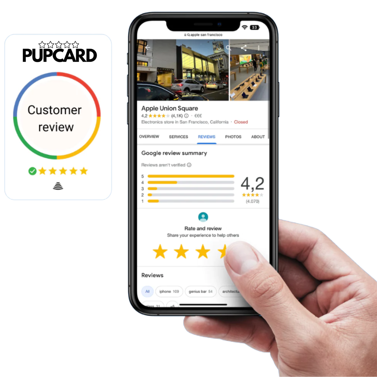 Präsentieren Sie Ihrem Kunden Ihre Pupcard. Dank der kontaktlosen Technologie (NFC) muss er lediglich sein Smartphone in die Nähe halten, um sofort auf Ihre Bewertungsseite weitergeleitet zu werden.